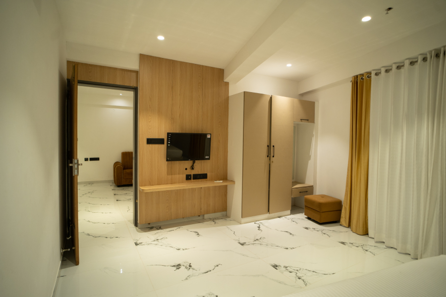 The Premium King Suite with Balcony (AC) offers an elevated stay experience with a perfect blend of luxury and comfort. Featuring a spacious layout, a plush king-size bed, and elegant interiors, this suite is designed for guests who appreciate style and relaxation. Step out onto the private balcony to enjoy refreshing views and peaceful moments. With modern amenities and a calming ambiance, this suite ensures a truly memorable and indulgent stay.